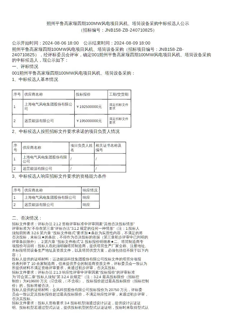 朔州平鲁高家堰四期100MW风电项目中标候选人第一名由电气风电预中标,投标报价为19250万元,中标单价为1925元/kW。
