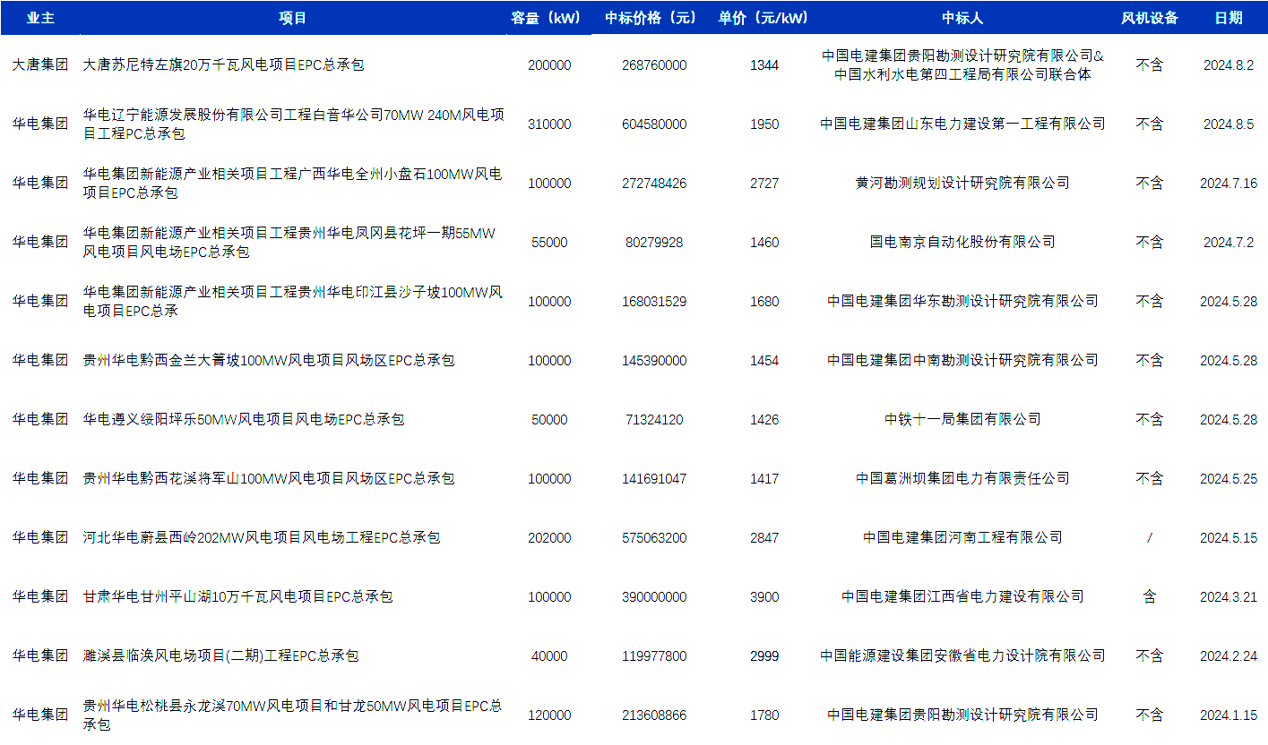 其中最低价出现在2024年8月2日公示的大唐苏尼特左旗20万千瓦风电项目EPC总承包项目中,该项目中标价格为268760000元,约合1344元/kW;最高价是濉溪县临涣风电场项目(二期)工程EPC总承包项目,该项目中标价格为119977800元,约合2999元/kW。