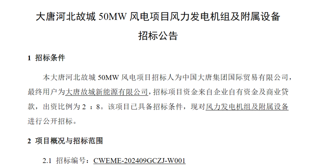 公告显示,大唐河北故城50MW风电项目总装机容量50MW,拟采购单机容量为5.0 MW的风机,叶轮直径 200米及以上;轮毂高度不低于 150米,不高于166米;不接受降容,不接受混排;塔筒形式为混塔。
