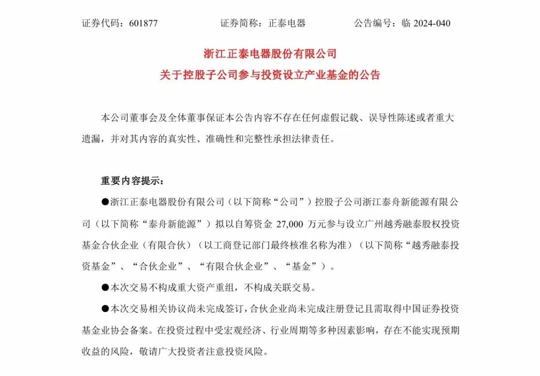 泰舟新能源系正泰电器控股子公司正泰安能的全资子公司,其拟以自筹资金27,000万元参与设立越秀融泰投资基金。
