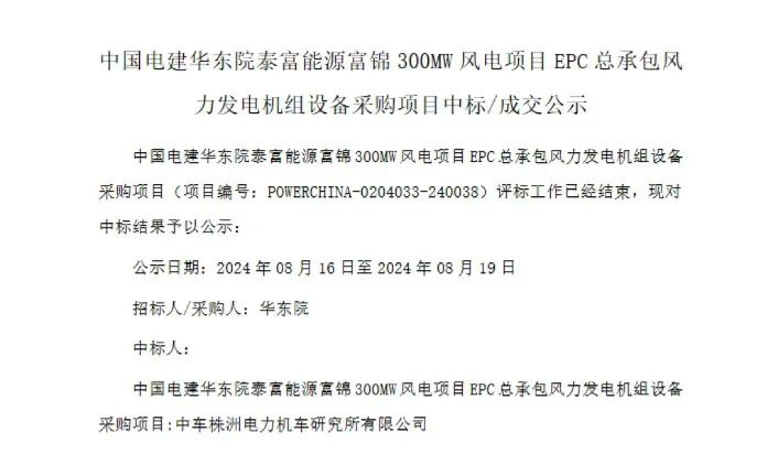 2、中国电建泰富能源富锦300MW风电项目EPC总承包风力发电机组设备采购中标公示,中车株洲所斩获。