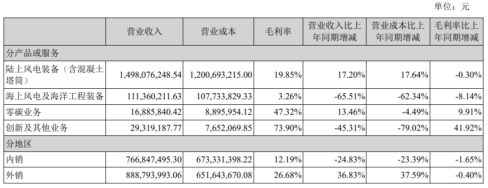 报告期内,泰胜风能陆上风电装备(含混凝土塔筒)实现营业收入14.98亿元,同比增长17.20%;海上风电及海洋工程装备实现营业收入1.11亿元,同比下降65.51%。