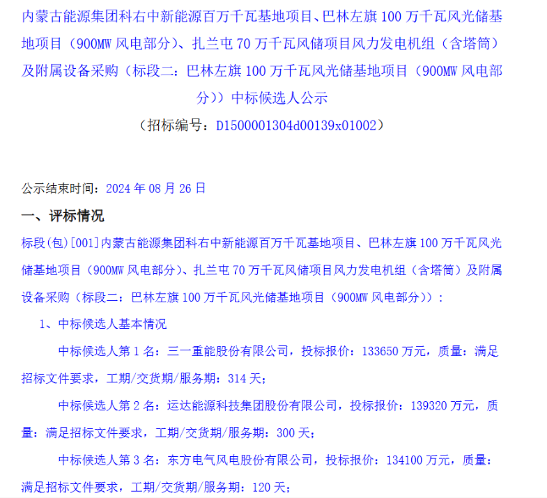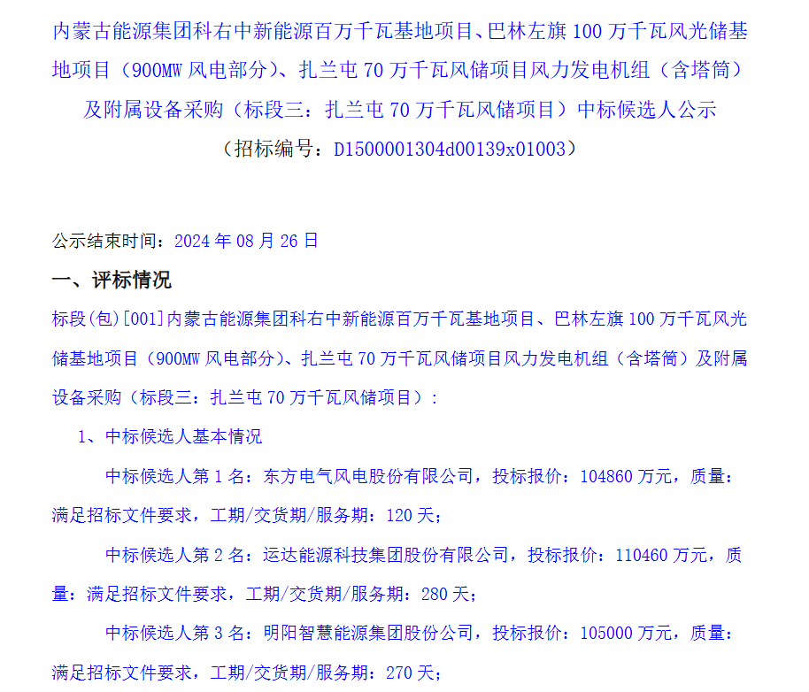 2024-04-30 8月23日,内蒙古能源集团科右中新能源百万千瓦基地项目、巴林左旗100万千瓦风光储基地项目(900MW风电部分)、扎兰屯70万千瓦风储项目风力发电机组(含塔筒)及附属设备采购中标候选公示。