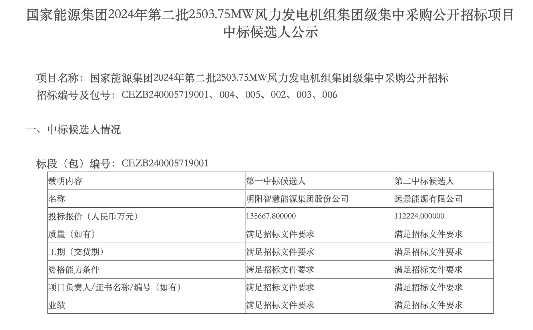 2024-04-30 国家能源集团发布《广东公司江门川岛二海上风电400MW(含钢塔)风力发电机组集中采购(标包一)》中标结果公告。公告显示,明阳智慧能源集团股份公司成功中标。据查询,该项目中标价格为135667.800000万元。