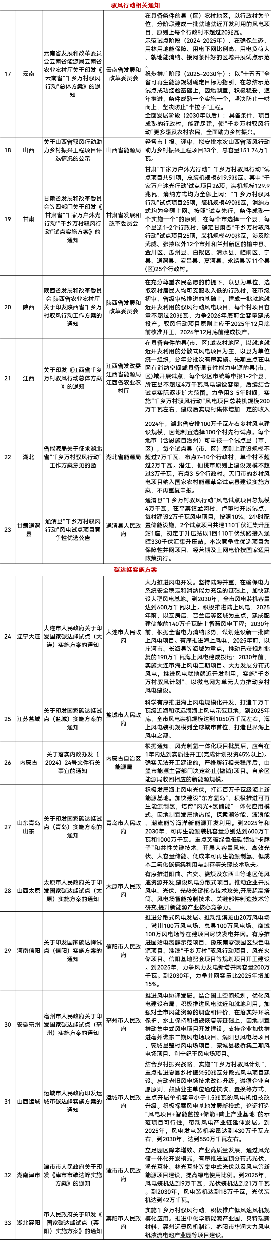 本月,在“驭风行动”方面,云南、山西、甘肃、陕西、江西、湖北、甘肃通渭县等地方均下发相关文件。其中,山西省拟安排驭风行动助力乡村振兴工程项目33个,总容量151.74万千瓦。甘肃省确定“千乡万村驭风行动”试点项目25项,装机规模490兆瓦。湖北省安排100万千瓦左右乡村风电建设规模,因地制宜选择100个村先行试点。通渭县“千乡万村驭风行动”风电试点项目总规模4万千瓦。