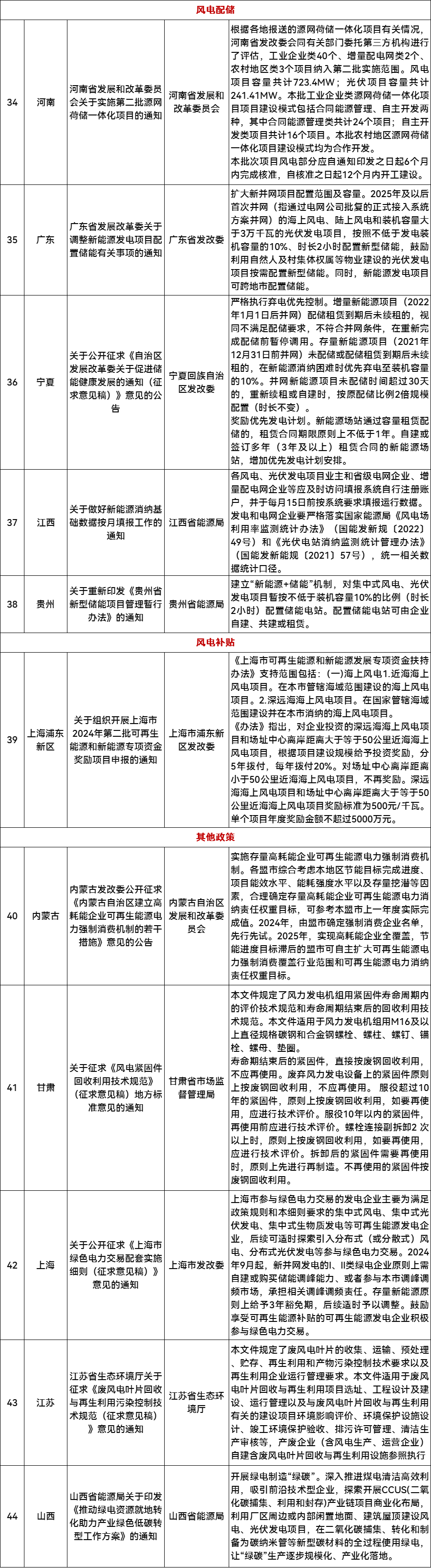风电配储:5条,河南、广东、宁夏、江西、贵州。