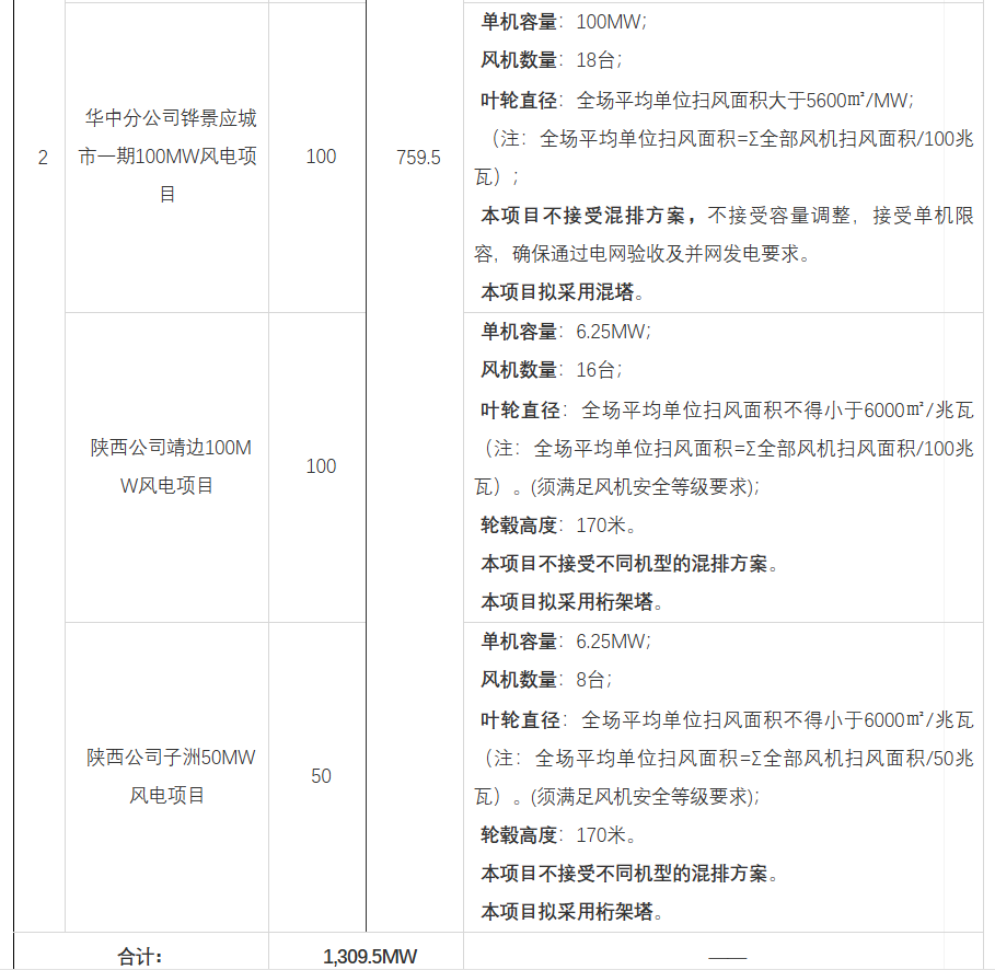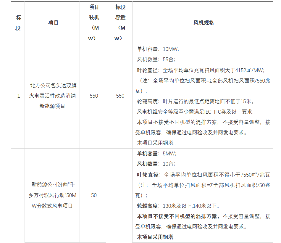 《华能北方公司达茂旗灵改配套等11个风电项目共计1309.5MW风力发电机组及其附属设备集中采购预招标公告》显示,华能此次招标共分为2个标段,总规模为1309.5MW,招标范围不含塔筒。其中包括2个驭风行动项目,共100MW。