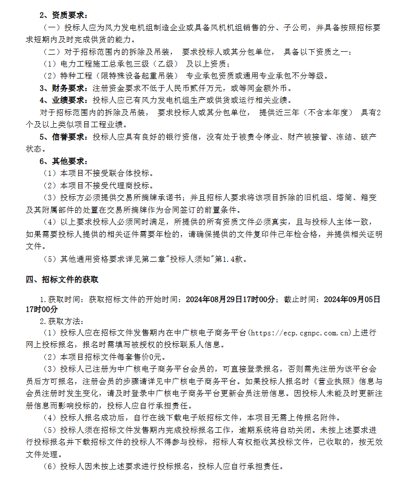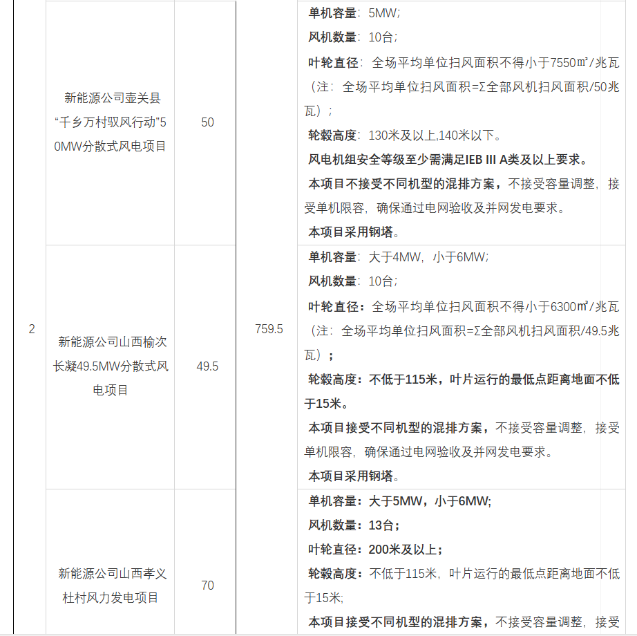 《中广核宁夏香山第二风电场大代小项目风力发电机组(含塔筒)设备采购》显示,该项目位于宁夏中卫市中宁县,项目总容量15MW。招标范围为,风机+塔筒+箱变拆除,风机+塔筒设备供货及吊装等。包括但不限于:1、项目总容量15MW(投标机型总容量不超过15MW),机位数量3台(投标机型台数不超过机位数量),单机容量5000kW及以上的全新制造、技术先进、性能稳定、安全可靠、包装完整的成套并网型风电机组、塔筒设备的相关采购和质保期服务。2、拆除容量15MW,保护性拆除10台机型为WD88-1500A的风力发电机组。4、风电场10套旧机组、塔筒、箱变及其附属部件的处置兜底。