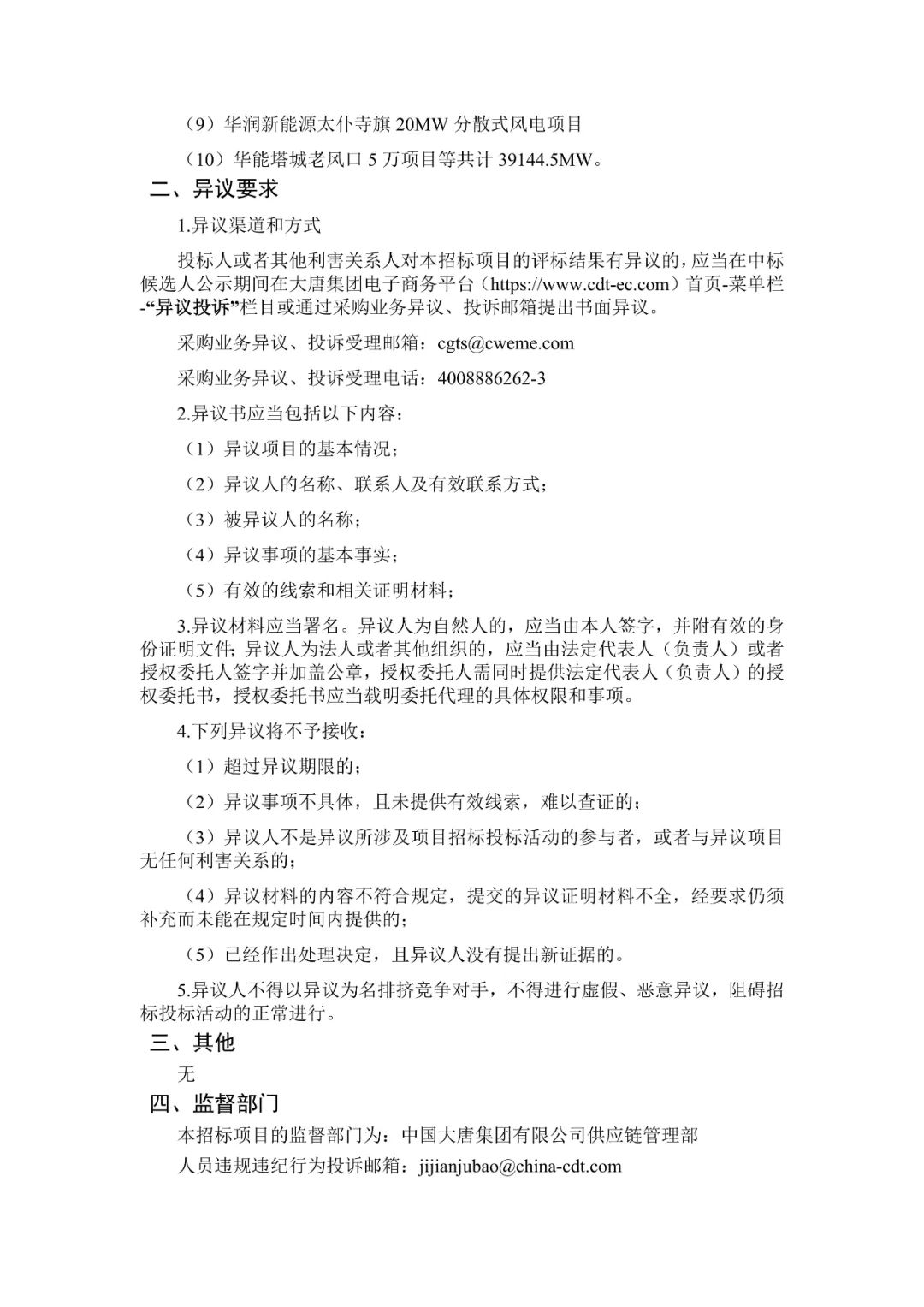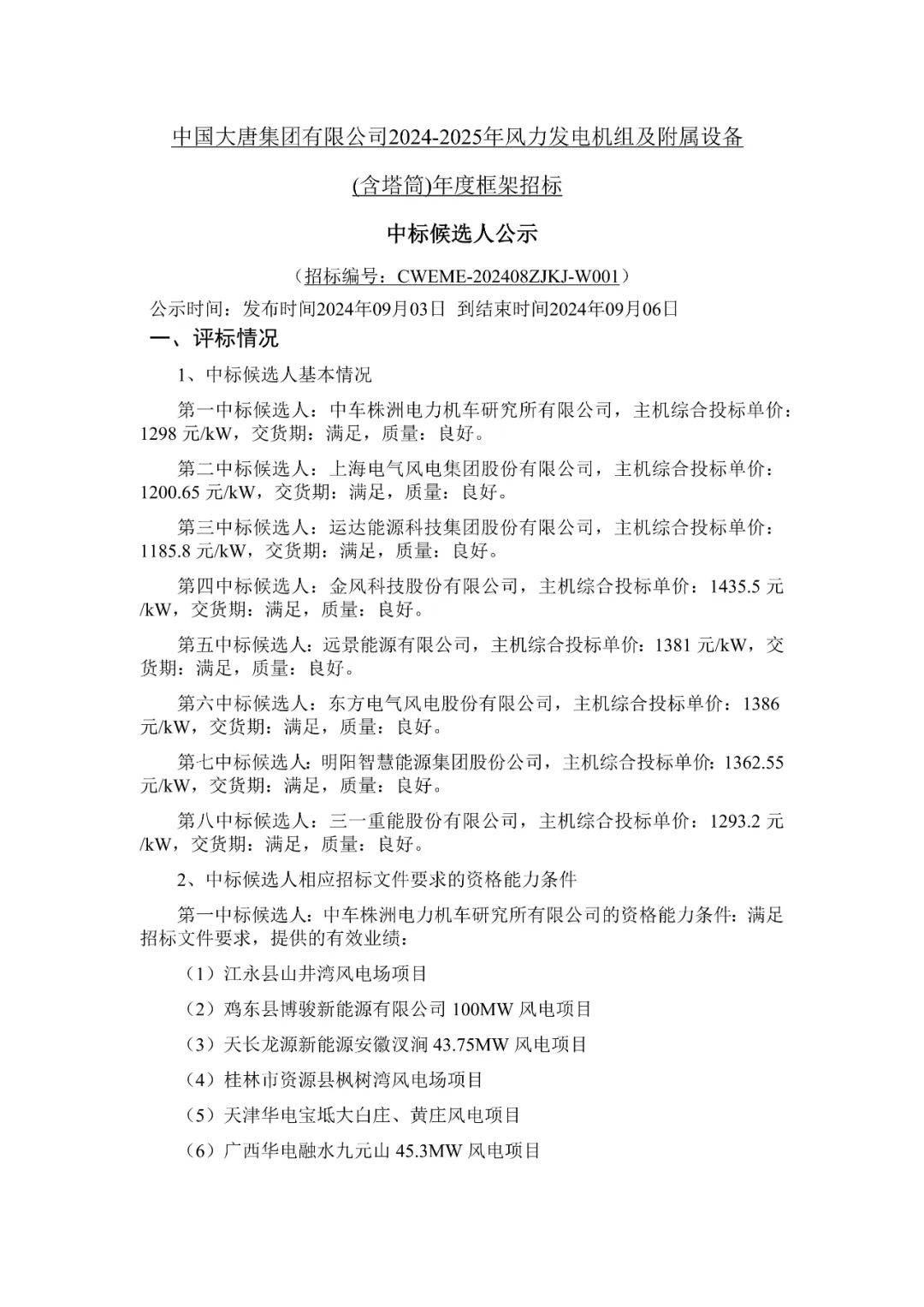 2024-04-30 据悉,9月3日,中国大唐集团有限公司2024-2025年风力发电机组及附属设备(含塔筒)年度框架招标中标候选人公示。
