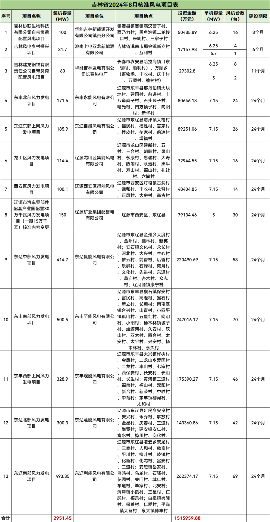 吉林核准13个风电项目,总规模2951.45MW,总投资1515959.88万元,均为陆上风电项目。