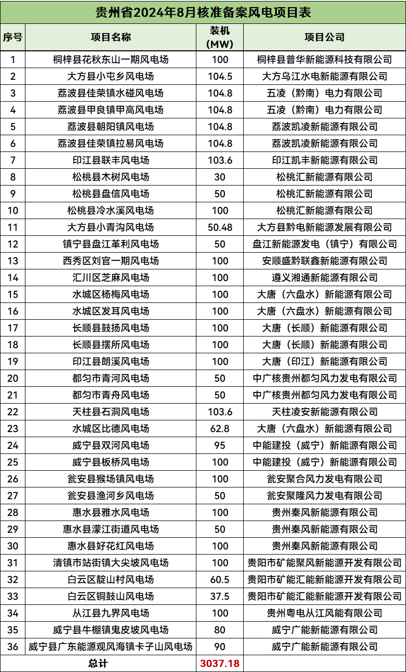 贵州核准36个风电项目,总规模3037.18MW,均为陆上风电项目。