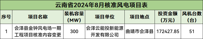 云南核准1个风电项目,总规模300MW,总投资172427.85万元,为陆上风电项目。