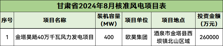 8月份,甘肃共计核准1个风电项目,总规模400MW,总投资260000万元。