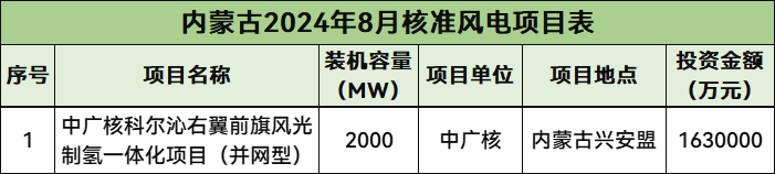 8月份,内蒙古共计核准1个风电项目,总规模2000MW,项目总投资约163亿元。