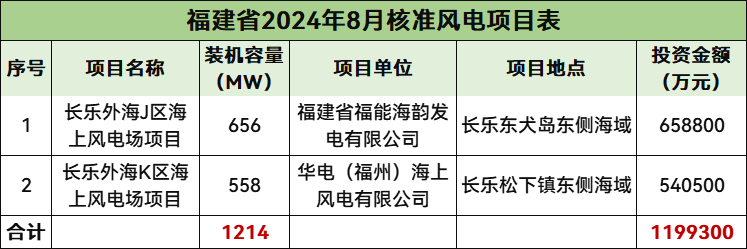8月份,福建共计核准2个风电项目,总规模1214MW,总投资1199300万元,均为海上风电项目。
