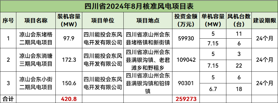 四川核准3个风电项目,总规模420.8MW,总投资259273万元,均为陆上风电项目。