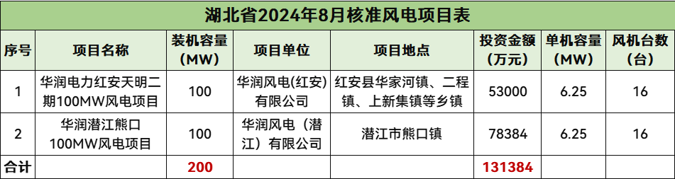 8月份,湖北共计核准2个风电项目,总规模200MW,总投资131384万元。