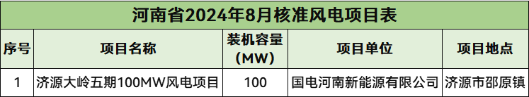 8月份,河南共计核准1个风电项目,总规模100MW。