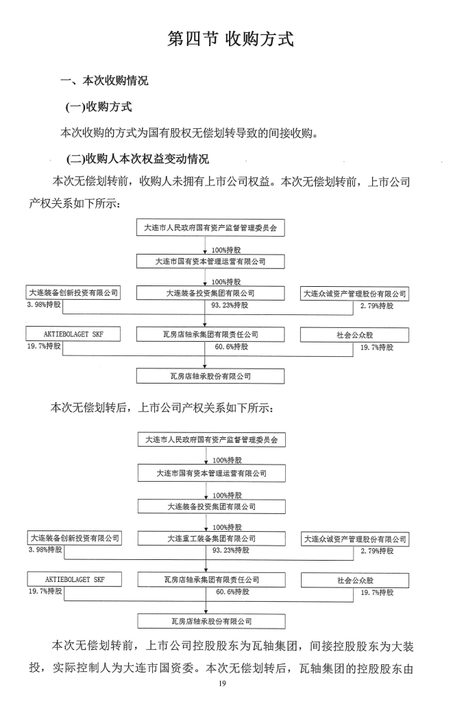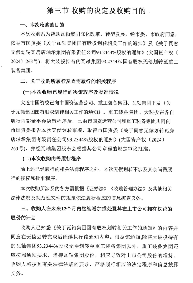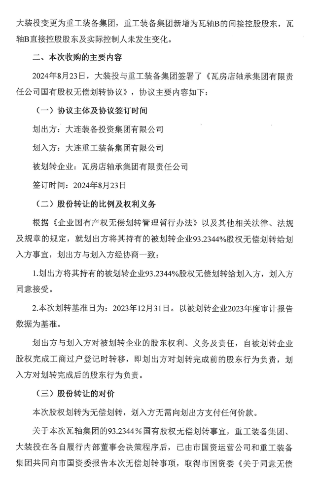 2024-04-30 近日,经辽宁大连市委市政府同意,瓦轴集团93.2344%股权将无偿划转给大连重工。这意味着大连重工将并购瓦轴,大连市两大风电龙头将合二为一。两者同属大连国资委旗下,不涉及其他批准程序;同是上市公司,需履行上市公司相关义务。