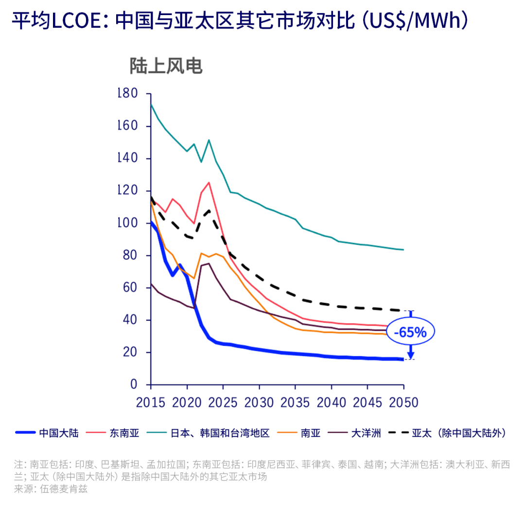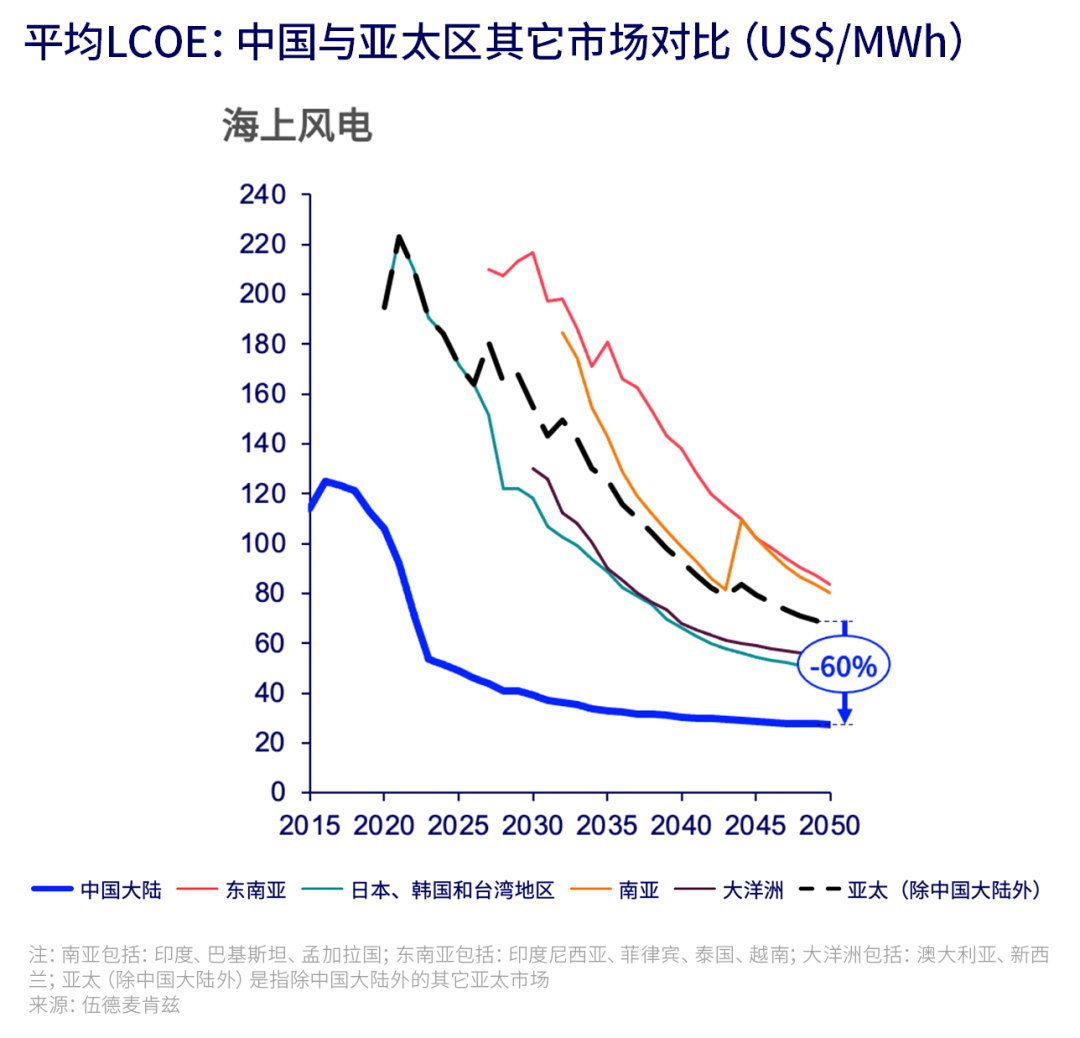 中国在可再生能源降本方面处于领先地位,尤其是在集中式光伏、陆上风电和海上风电领域,平均度电成本较其它地区低40-70%。