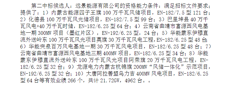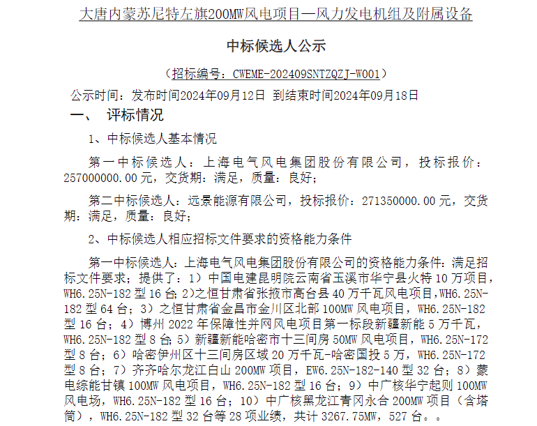 2024-04-30 9月12日,大唐河北故城50MW风电项目及大唐内蒙苏尼特左旗200MW风电项目风力发电机组及附属设备中标候选人公示,金风科技预中标50MW,投标报价8000万元,不含塔筒单价1600元/kW;电气风电预中标200MW,投标报价25700万元,不含塔筒单价1285元/kW。