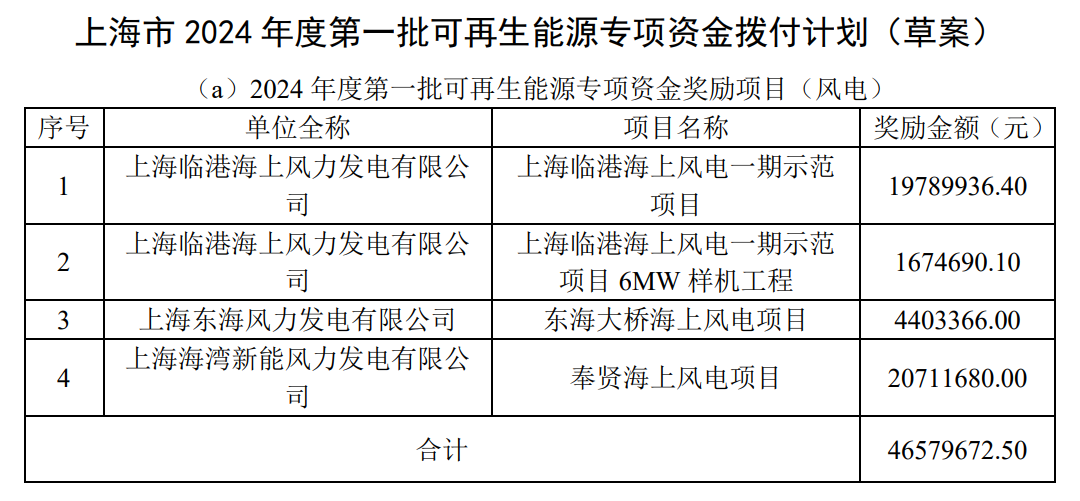 根据公示,本次共4个海上风电项目获得补贴,奖励金额累计46579672.50元。其中,上海临港海上风电一期示范项目奖励金额19789936.40元;上海临港海上风电一期示范项目6MW样机工程奖励金额1674690.10元;东海大桥海上风电项目奖励金额4403366.00元;奉贤海上风电项目奖励金额20711680.00元。