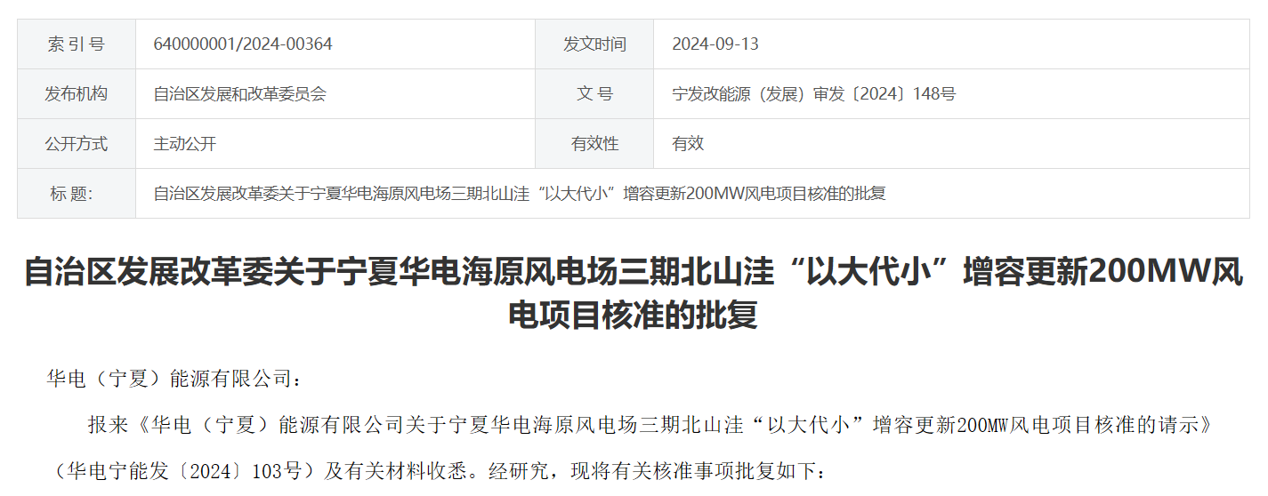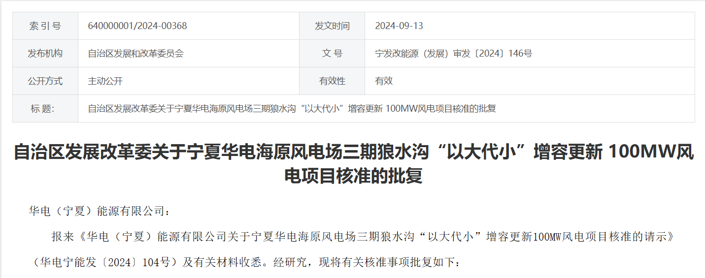 宁夏华电海原风电场三期狼水沟以大代小增容更新100MW风电项目