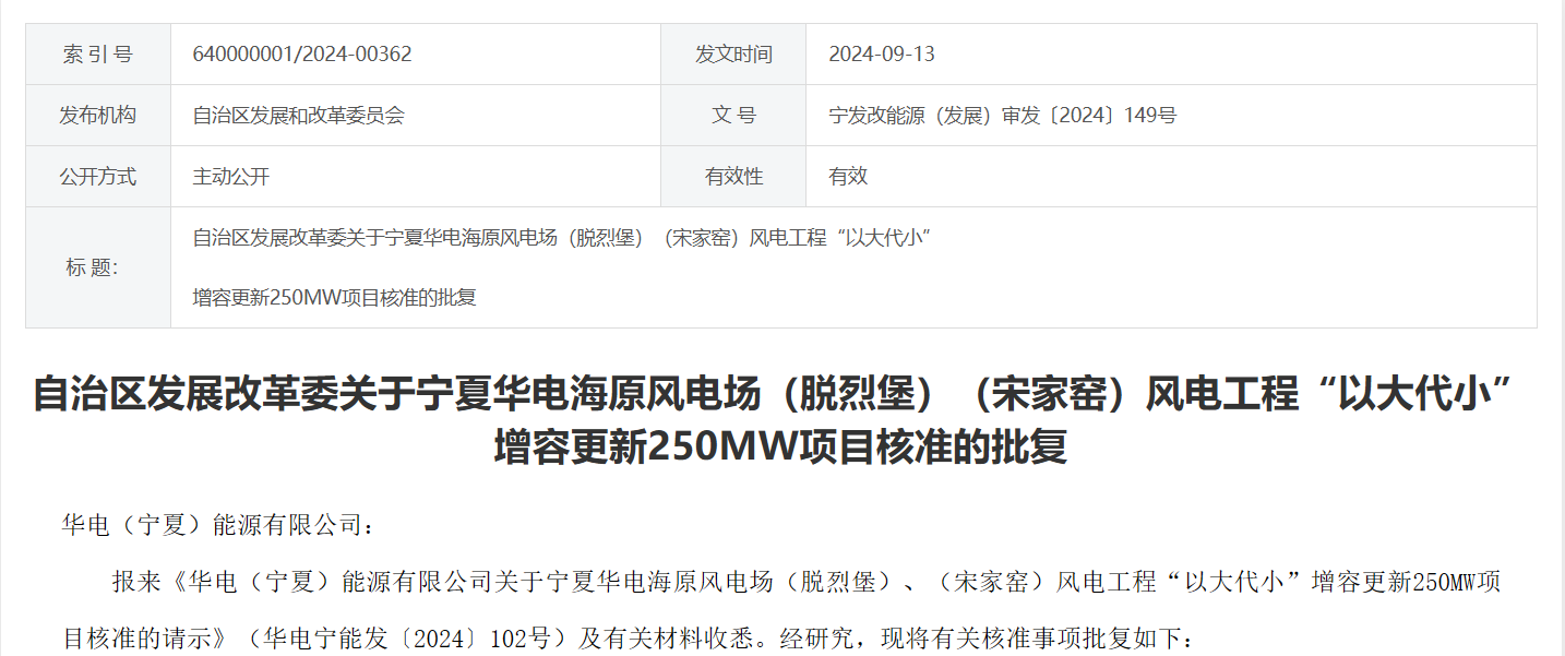 宁夏华电海原风电场(脱烈堡)(宋家窑)风电工程以大代小增容更新250MW项目