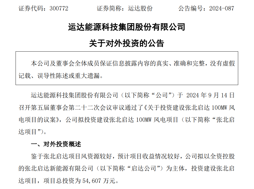 9月18日,运达股份发布公告披露,公司拟以全资控股的张北启达新能源有限公司(以下简称启达公司)为主体,投资建设张北启达100MW风电项目(以下简称张北启达项目),项目总投资为54,607万元。