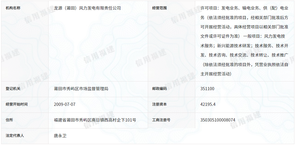 企业工商信息显示,龙源(莆田)风力发电有限责任公司成立于2009年7月7日,经营范围包括:许可项目:发电业务、输电业务、供(配)电业务。一般项目:风力发电技术服务;新兴能源技术研发;技术服务、技术开发、技术咨询、技术交流、技术转让、技术推广。该企业由龙源电力集团股份有限公司100%持股。