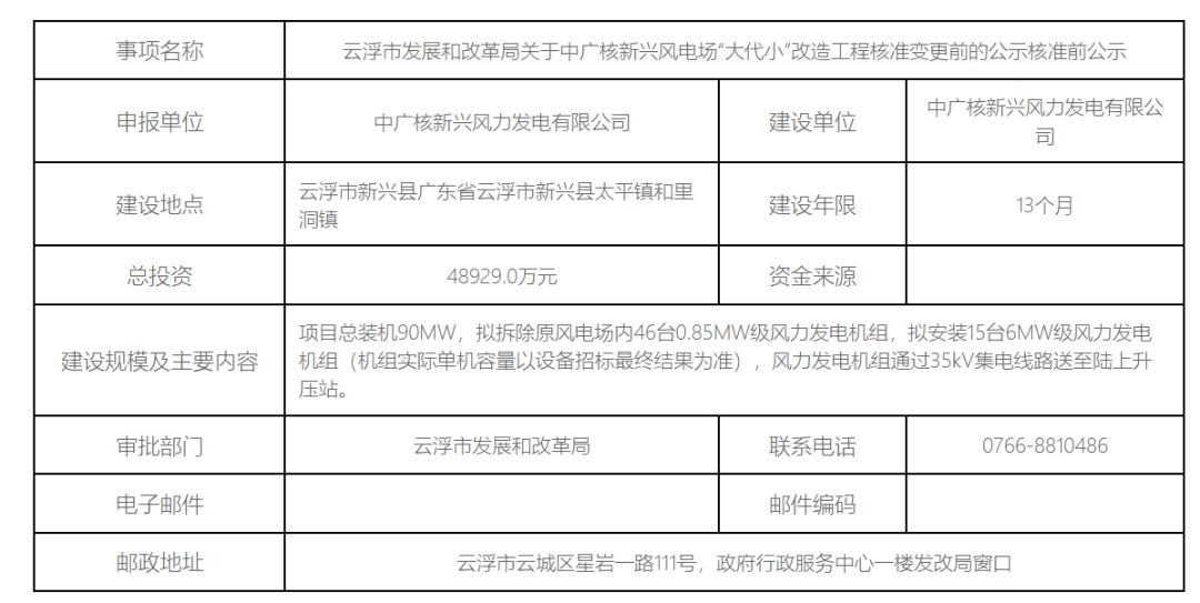 此外,据云浮市新兴县发展和改革局7月10日公布的《中广核新兴风电场大代小改造工程社会稳定风险评估信息公示》,新兴风电场原装机容量为39.1MW。