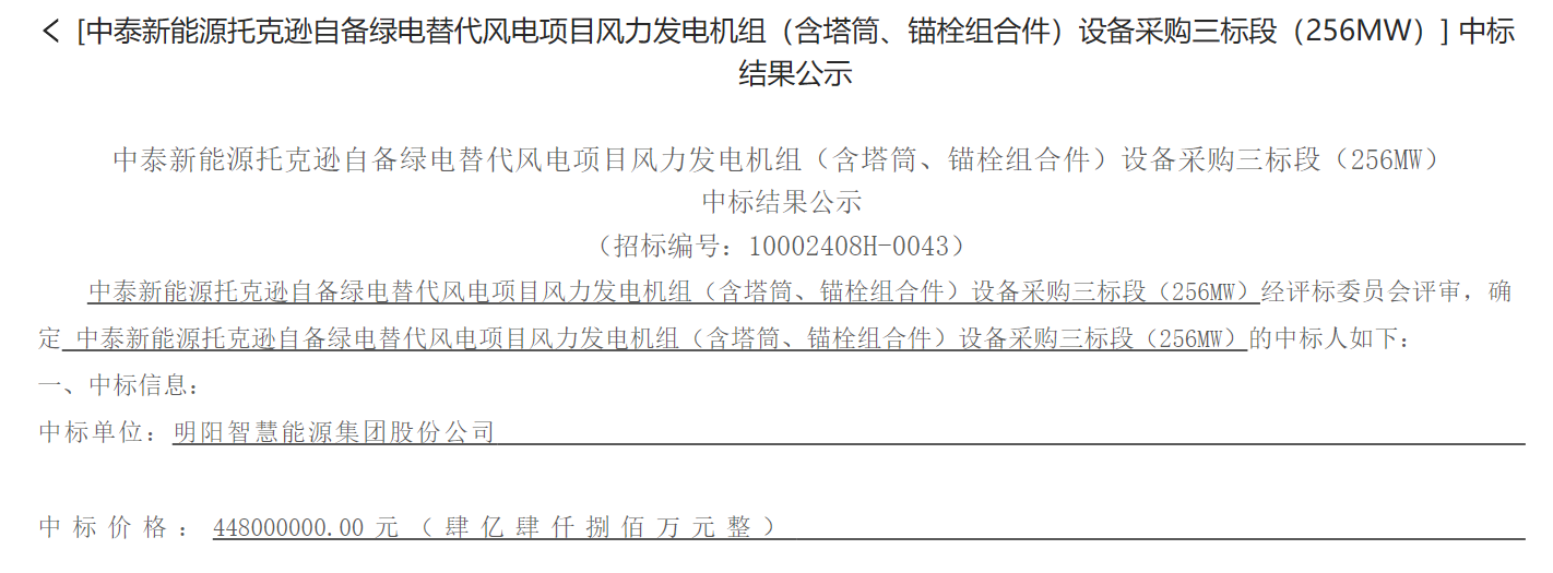2024-04-30 9月26日,中泰集团招标投标网发布中泰新能源托克逊自备绿电替代风电项目风力发电机组(含塔筒、锚栓组合件)设备采购一标段(448MW)、三标段(256MW)中标结果公示的公告。