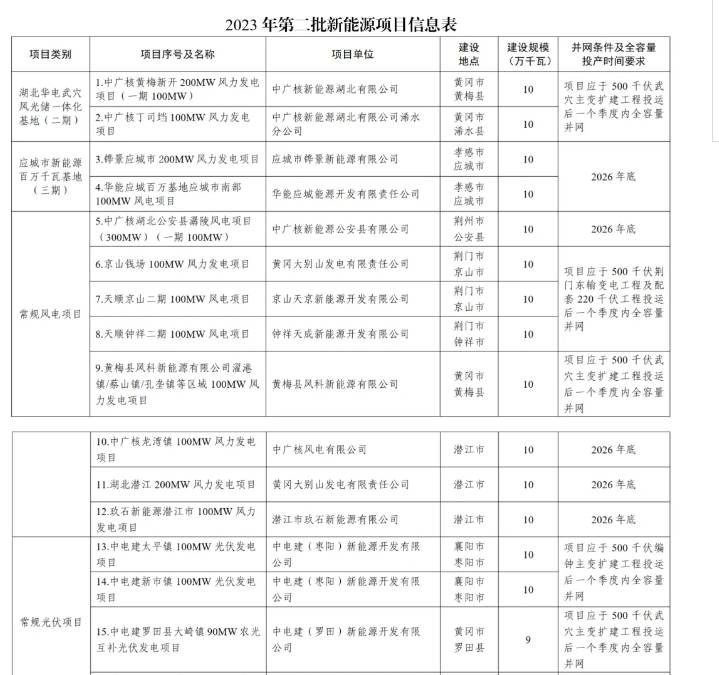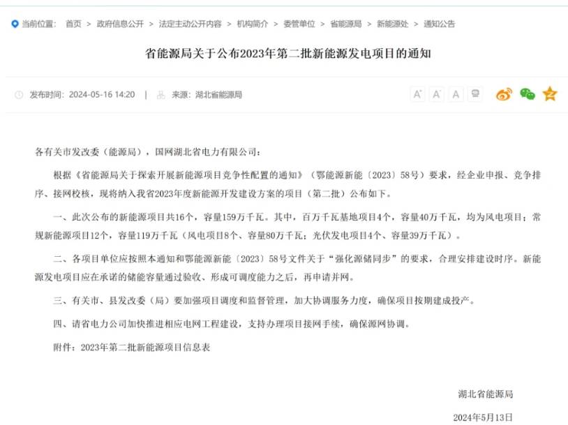 5月16日,湖北省公布2023年第二批新能源发电项目名单,此次公布的新能源项目共16个,容量159万千瓦。其中,百万千瓦基地项目4个,容量40万千瓦,均为风电项目;常规新能源项目12个,容量119万千瓦(风电项目8个、容量80万千瓦;光伏发电项目4个、容量39万千瓦)。