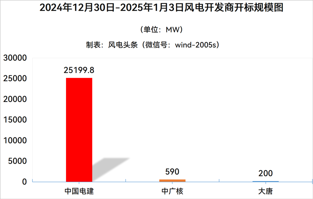 据统计,2024年12月30日-2025年1月3日风电整机采购开标总计25989.8MW,风电机组招标总计221.1MW;风电塔筒采购开标总计50MW,风电塔筒招标总计690MW。