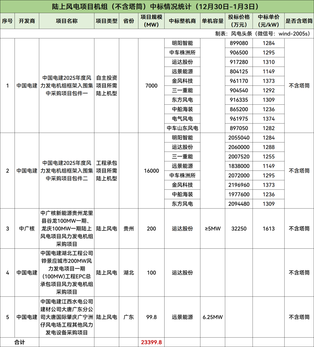 中国电建开标25199.8MW,明阳智能、中车株洲所、运达股份、远景能源、金风科技、三一重能、东方风电、中船海装、电气风电、中车山东风电共同中标25GW,运达股份中标100MW,远景能源中标99.8MW。