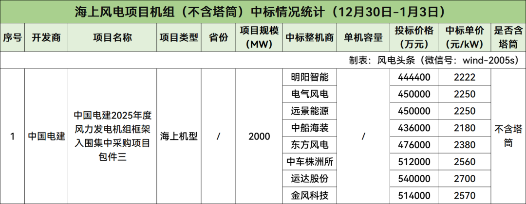 据统计,本周不含塔筒海上风电项目共计1个,为中国电建2025年度风力发电机组框架入围集中采购项目,海上总量预计为2GW,项目中标均价为2389元/kW。