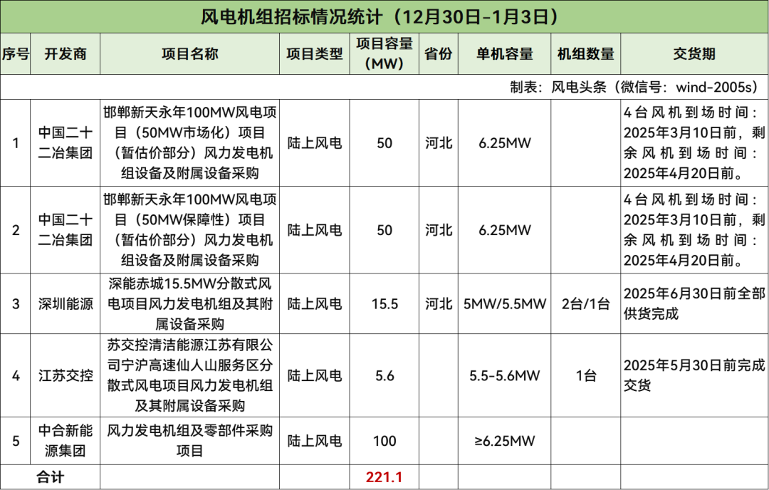 统计,本周风机招标市场方面,共5个项目221.1MW风机启动采购,开发商是中国二十二冶集团、深圳能源、江苏交控、中合新能源集团。