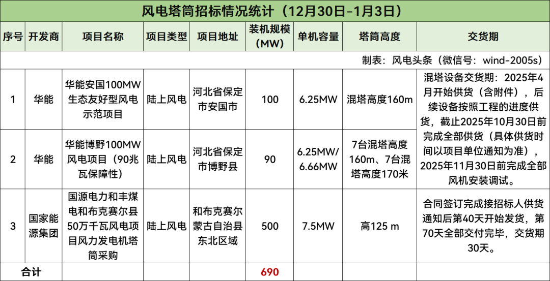 据统计,本周风电塔筒招标市场方面,共3个项目690MW塔筒启动采购,开发商是华能、国家能源集团。