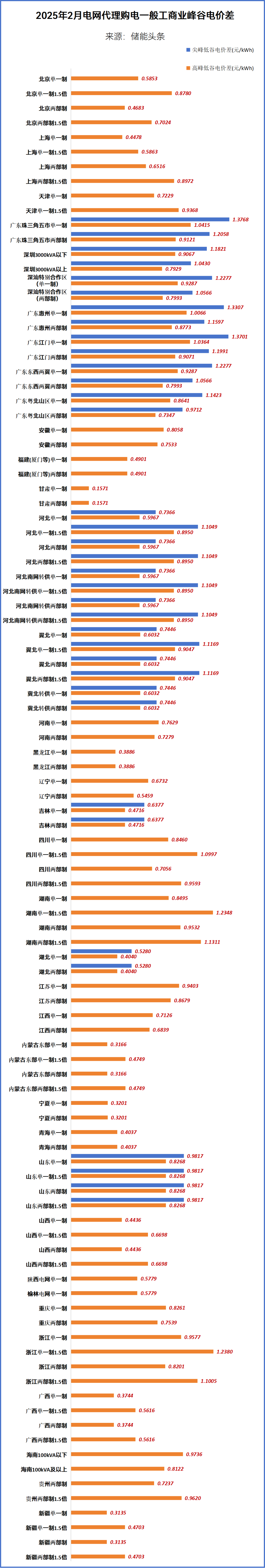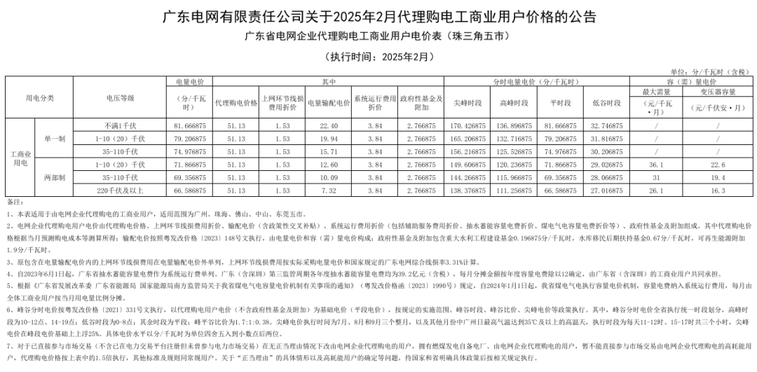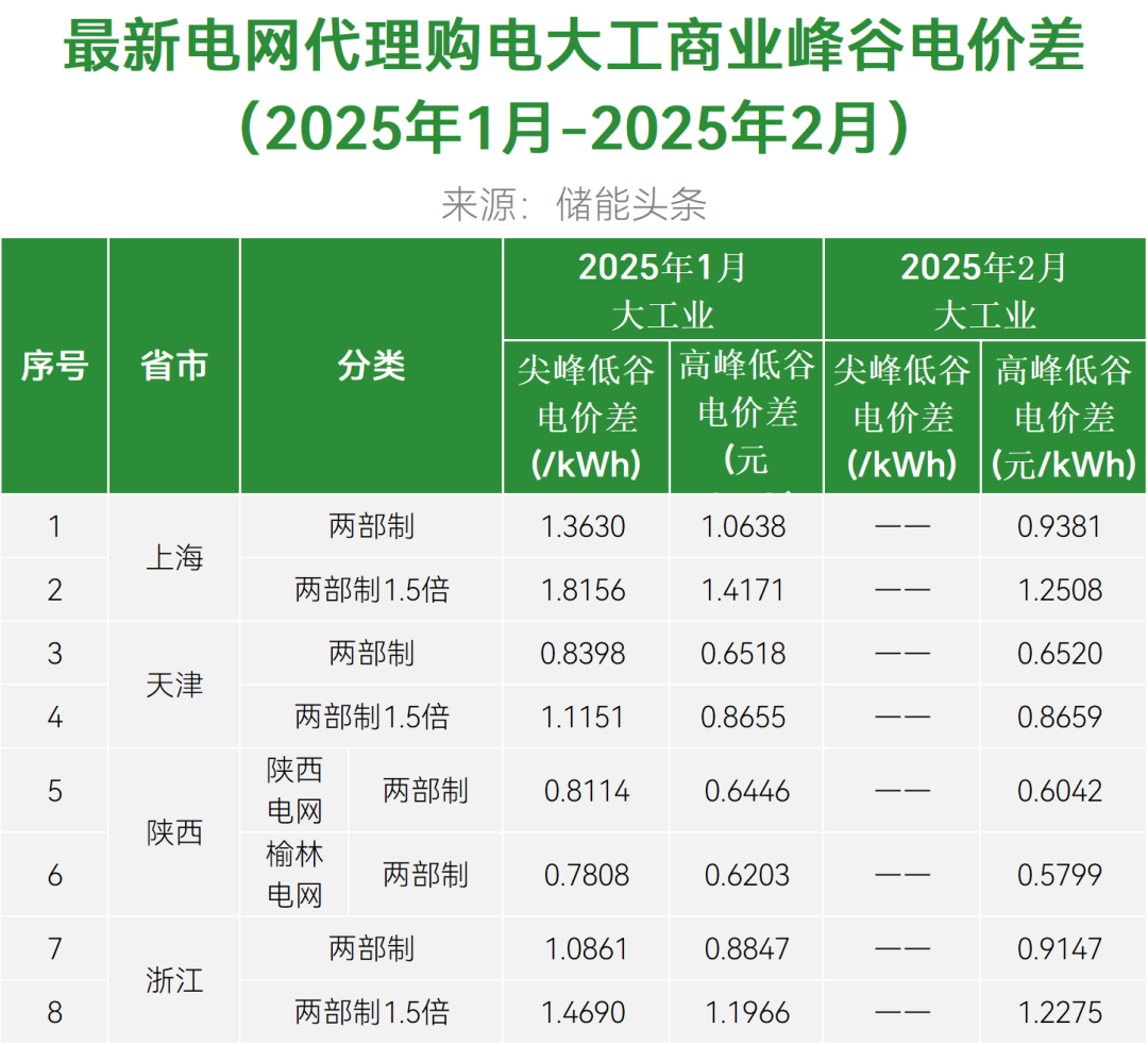 了解到,2025年2月电网代购电价格中,全国峰谷价差最高的是珠三角五市,执行一般工商业单一制尖峰电价时,峰谷价差为1.3768元/kWh。