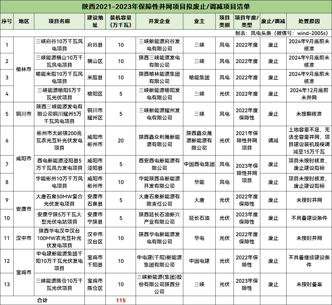 以及汉中、安康、宝鸡公示的2021-2023年度保障性新能源项目废止清单,共计废止/调减风电、光伏项目1150MW。其中拟废止风电项目6个,规模合计500MW;拟废止光伏项目6个,规模合计450MW;拟调减光伏项目1个,规模200MW,项目建设装机规模调减至150MW。