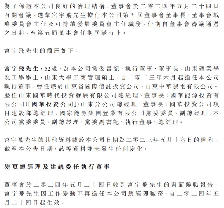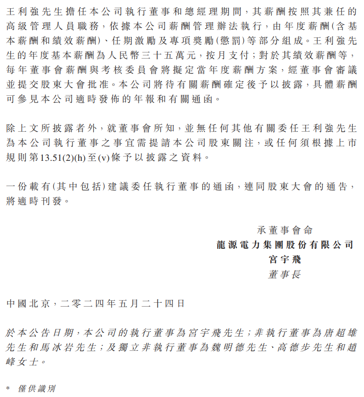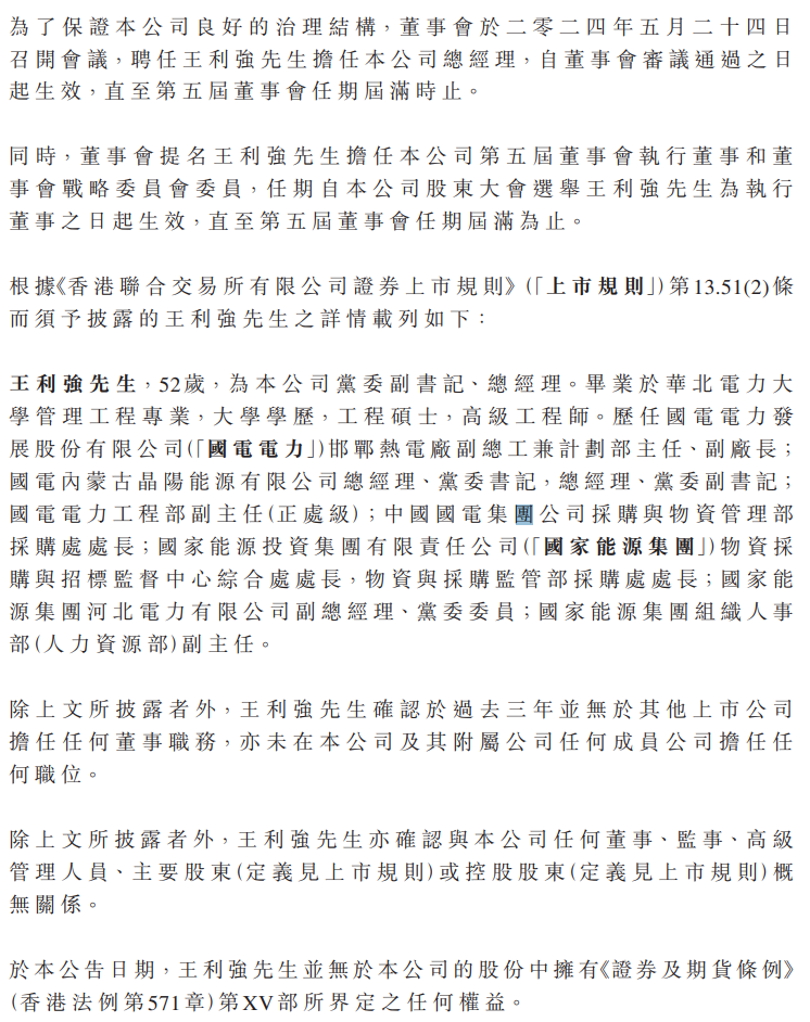据悉,5月24日,龙源电力发布《变更董事长、变更总经理及建议委任执行董事》公告。