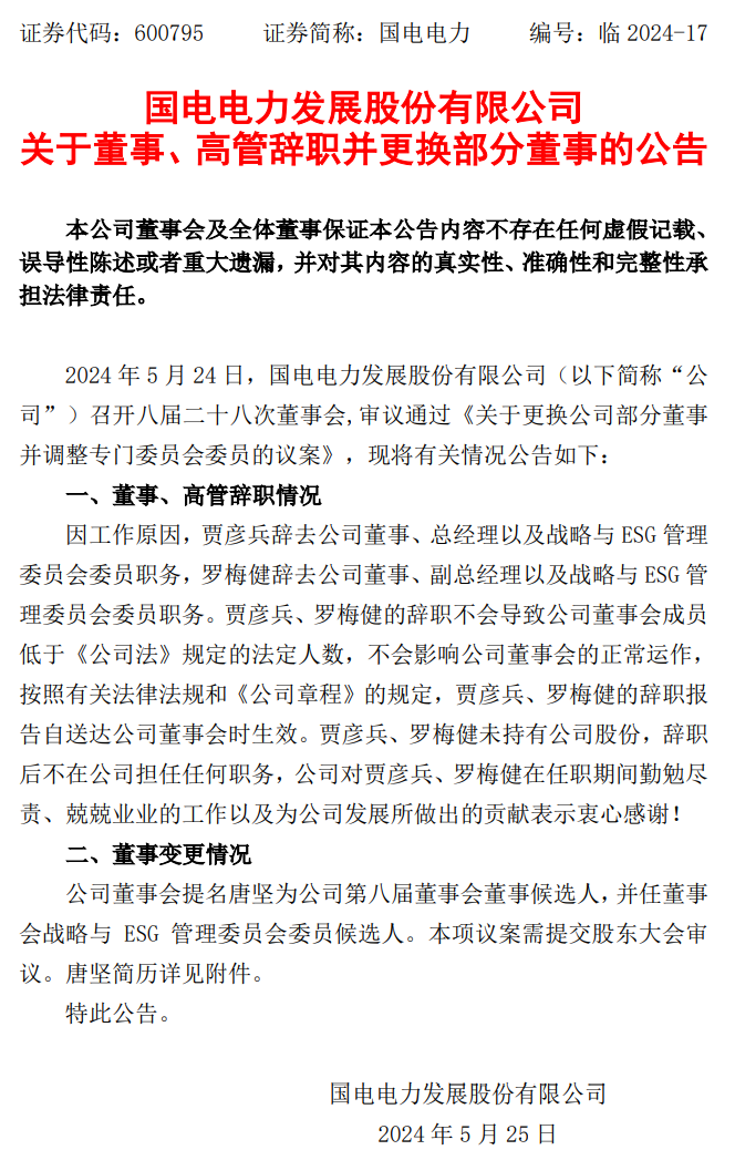 同日,国电电力发布《关于董事、高管辞职并更换部分董事的公告》。