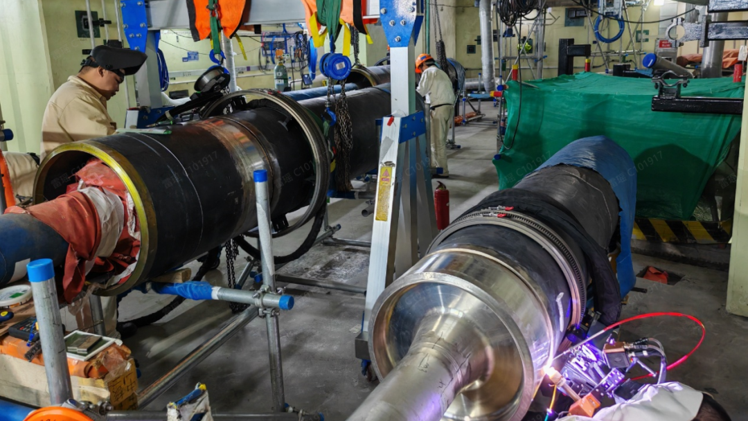 陆丰核电项目部针对上述难题,开发了一套适用于贯穿件机械化焊接的专用工装、工艺。该工艺通过精确控制焊接电流、电压、焊接速度等参数,优化了热输入模式,有效解决了大厚壁和异种钢焊接的难题,并成功解决了贯穿件所有对接焊口的机械化焊接。