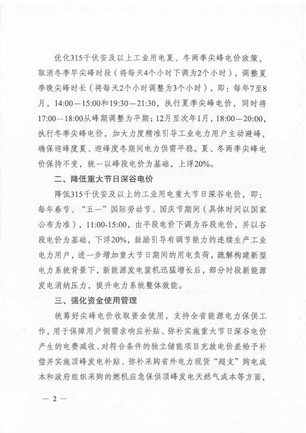 内容指出,优化315千伏安及以上工业用电夏、冬两季尖峰电价政策,取消冬季早尖峰时段(将每天4个小时下调为2个小时),调整夏季晚尖峰时长(将每天2个小时调整为3个小时),即:每年7至8月,14:00-15:00和19:30-21:30,执行夏季尖峰电价,同时将17:00-18:00从峰期调整为平期;12月至次年1月,18:00-20:00,执行冬季尖峰电价,加大力度精准引导工业电力用户主动避峰,确保迎峰度夏、迎峰度冬期间电力供需平稳。夏、冬两季尖峰电价保持不变,统一以峰段电价为基础,上浮20%。