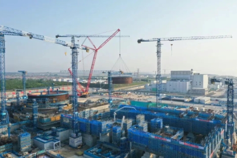 本次吊装的模块五由筒体五层、筒体六层及附属的多个贯穿件套筒以及预埋件组成,是目前石岛湾核电扩建一期核岛钢衬里模块中一次性吊装高度最高的模块。