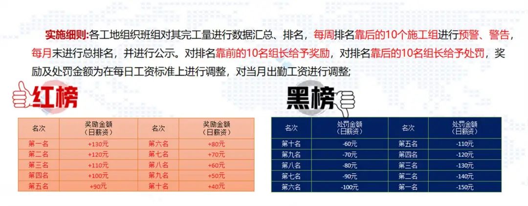 最具创新性的最小作业单元红黑榜 制度,通过每月奖惩排名,全面提高了职工施工的主动性,确保施工任务及时完成。