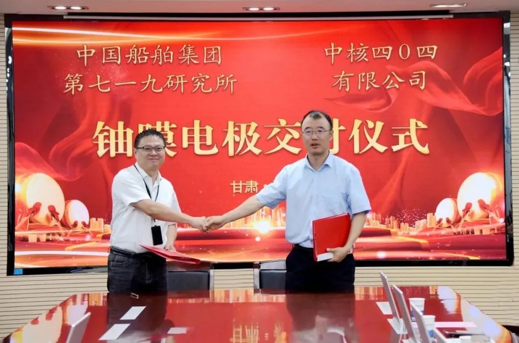 中核四0四有限公司总经理王垣与中国船舶集团第七一九研究所六室主任王益元共同签署了交付文件。中国船舶集团第七一九研究所首席专家左亮周及双方相关技术专家、项目团队成员代表参加了仪式。