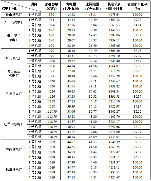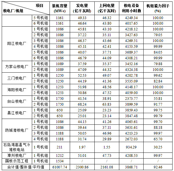 2)本表合计值/整体值/平均值中,装机容量、发电量、上网电量为各机组合计值,核电设备利用小时数为全部机组整体值,机组能力因子为全部参与统计机组的算数平均值。