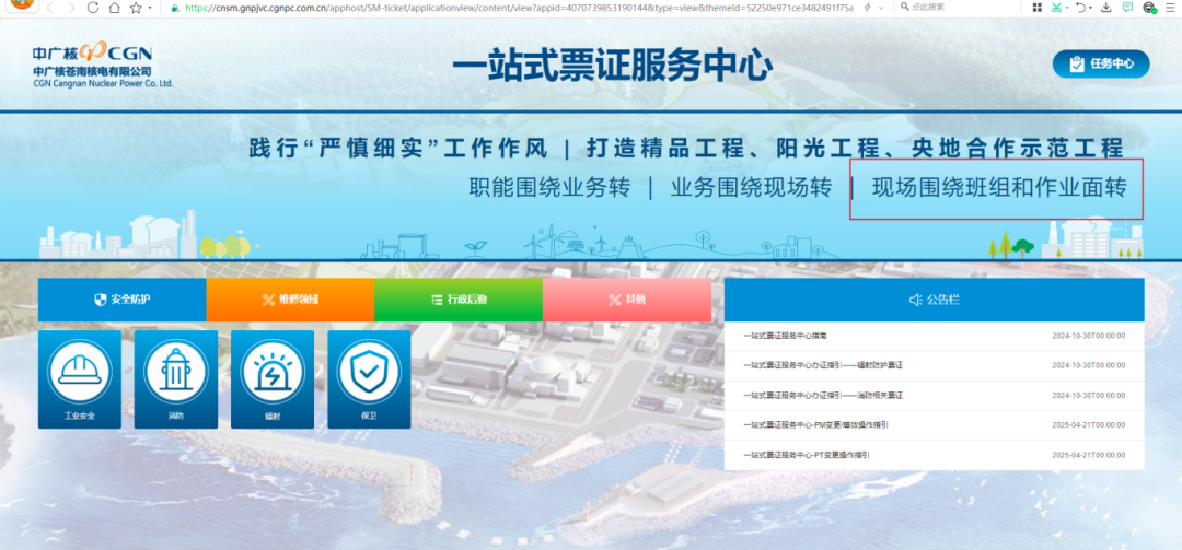 一站式票证服务中心已在三澳核电项目正式上线运行,该中心整合安全防护、维修领域、行政后勤等各领域审批类票证,实现首批 37 张生产票证电子化,解决了传统票证分散、移动办公不便、纸质化及新增票证上线难等痛点,逐步实现无纸化办公。