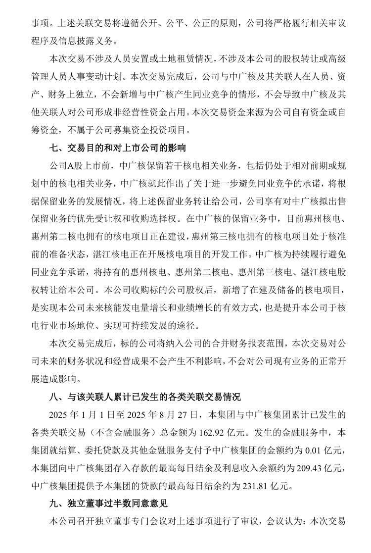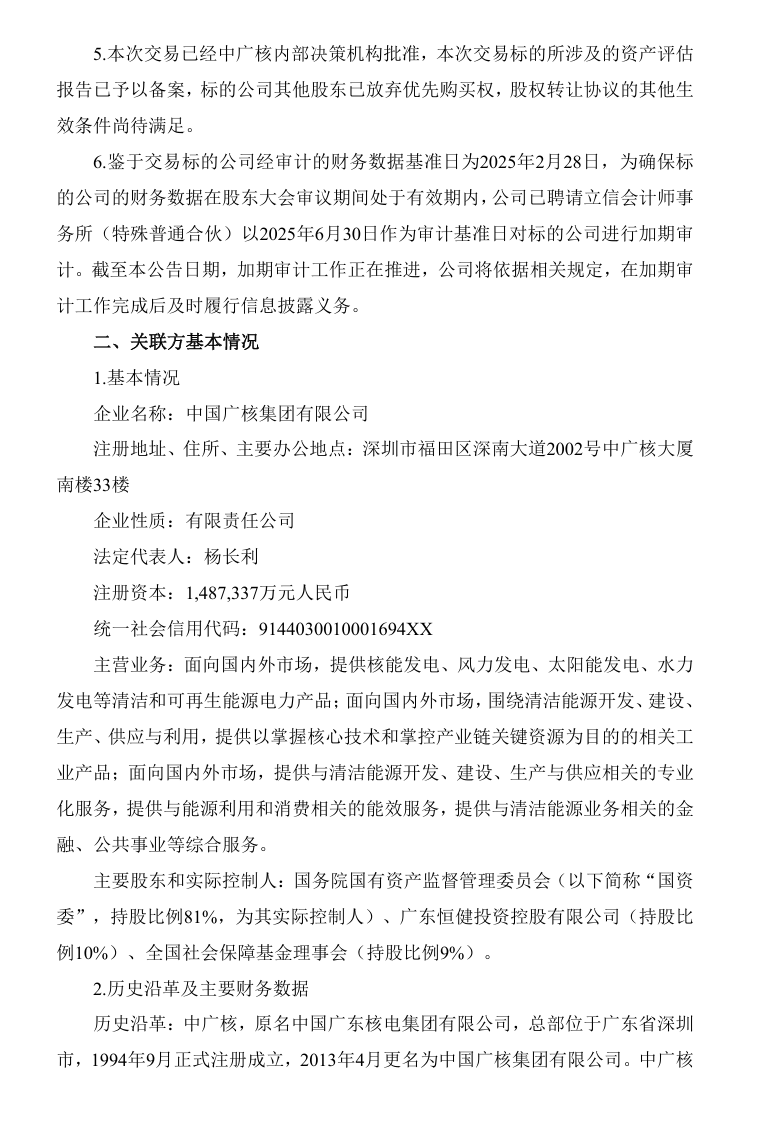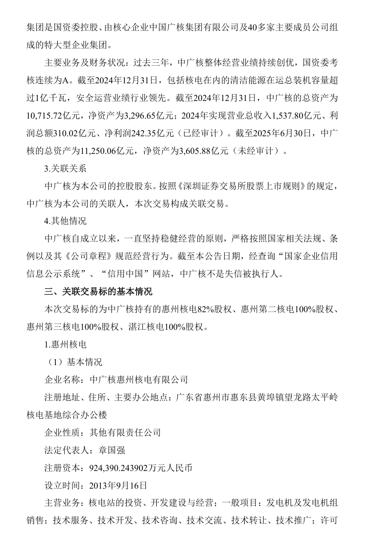 2024-04-30 中广核为中广核电力的控股股东,按照《深圳证券交易所股票上市规则》的规定,中广核为中广核电力的关联人,本次交易构成关联交易。本次交易不构成《上市公司重大资产重组管理办法》中所规定的重大资产重组情形,也不需要经过有关部门的批准。